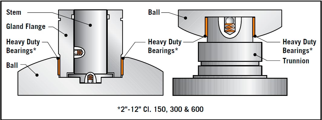 Trunnions are supported by heavy duty teflon® coated steel bearings. Thrust load on the ball is supported by large trunnions mounted within captured trunnion blocks, resulting in low operating torque and seat wear.